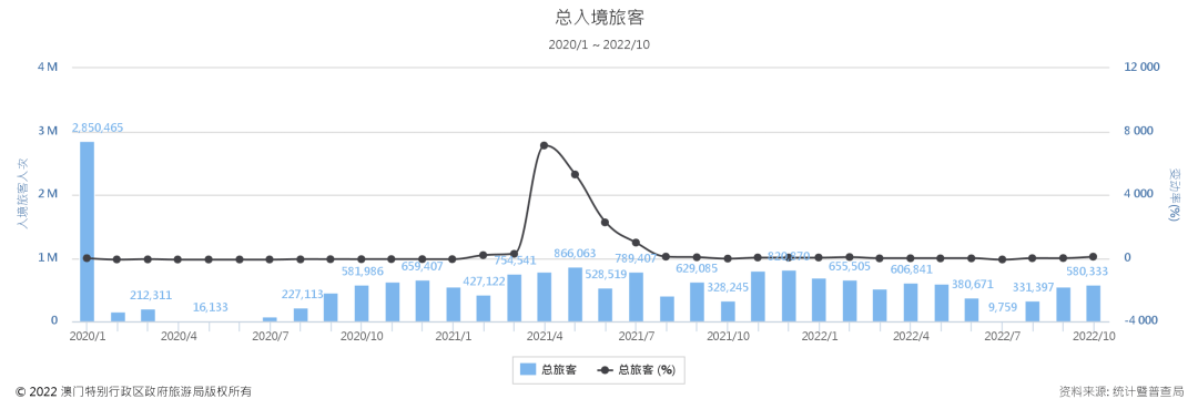 大疫三年,若按年为统计单位,2020年-2022年(2022年仅统计1月-10月的数据)入境澳门旅客的总量分别为590万人次、770万人次以及494万人次,对比2019年的3941万人次,可以说是望尘莫及。