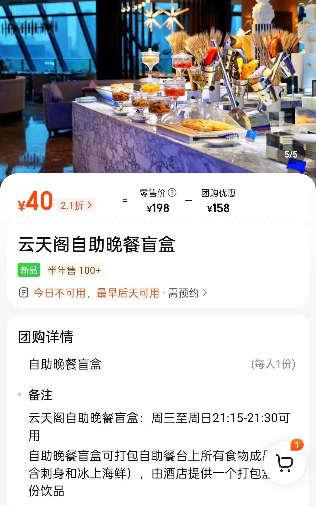 据消息,杭州国寿君澜大饭店近日推出了自助晚餐盲盒,标价40元,周三至周日晚上9点15分至9点30分可用,可打包自助餐台上所有食物成品(不含刺身和冰上海鲜)。而正常的自助晚餐则需要298元一份,菜品有30来种,荤素搭配,中西结合。