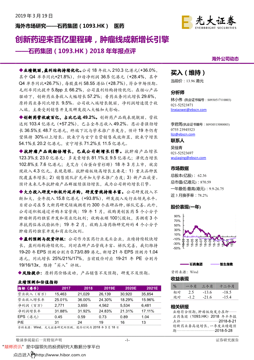 -1-证券研究报告2019年3月19日 海外市场研究——石药集团(医药创新药迎来百亿里程碑,肿瘤线成新增长引擎——石药集团(1093.HK)2018年年报点评 海外公司动态 ◆业绩靓丽,盈利结构持续优化。