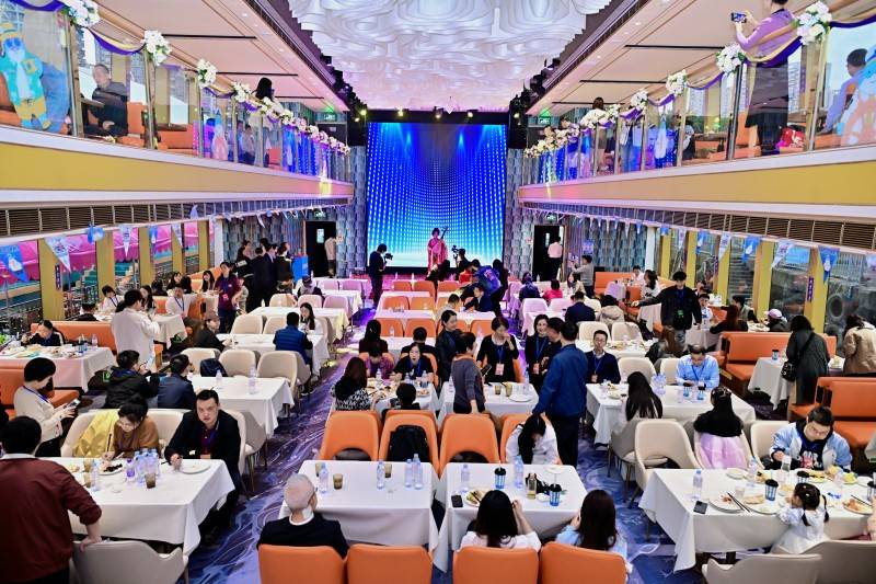 “浪漫珠海号”将智能科技、海洋美学与功能空间深度融合,打造“海上移动会客厅”。游轮采用海豚仿生船身设计与莲花元素装饰,既呼应珠海“浪漫之城”和“百岛之市”的生态特质,又暗合珠澳文化交融的城市底蕴。内部采用全景中空挑高布局,贯穿上下层的通透中庭搭配大面积落地窗与开放式观光甲板,360度无遮挡观赏珠澳双城天际线、港珠澳大桥、澳门半岛地标等景观,空间开阔明亮,兼具观光视野与仪式感。夜晚点亮的动态灯光系统更让其成为湾区海面的“流动星河”。