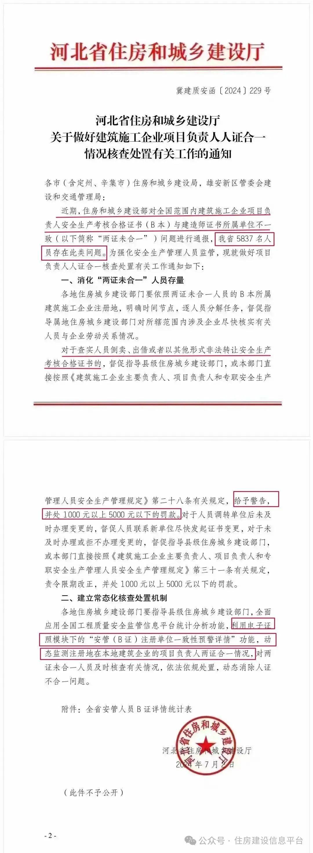 近期,住建部对全国范围内B证和建造师证“两证不合一”问题进行通报,我省5837名人员存在此类问题。
