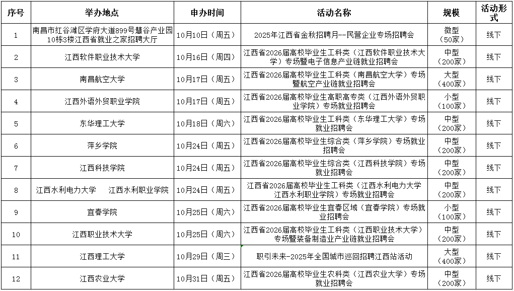 10月10日江西省就业之家(南昌市红谷滩区学府大道899号慧谷产业园10栋3楼);