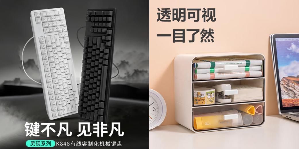 外设与小件同样助力办公效率提升:罗技K848有线机械键盘采用定制化设计与办公优化调校,能显著提升文字输入效率;得力双电源计算器与抽屉式收纳盒,则为财务计算与桌面整理提供贴心支持,均可享企业专享价优惠采购。