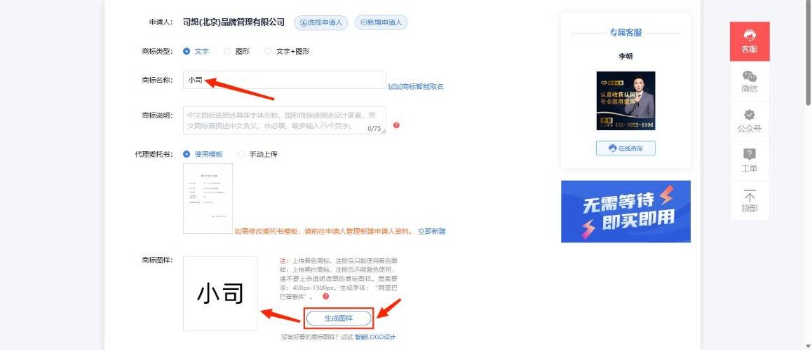 文字商标:输入文字图形商标:选择图形组合商标:选择文字+图形③ 上传商标图形无设计图样:可选择自动【生成图样】有设计图样:直接点击【上传图样】