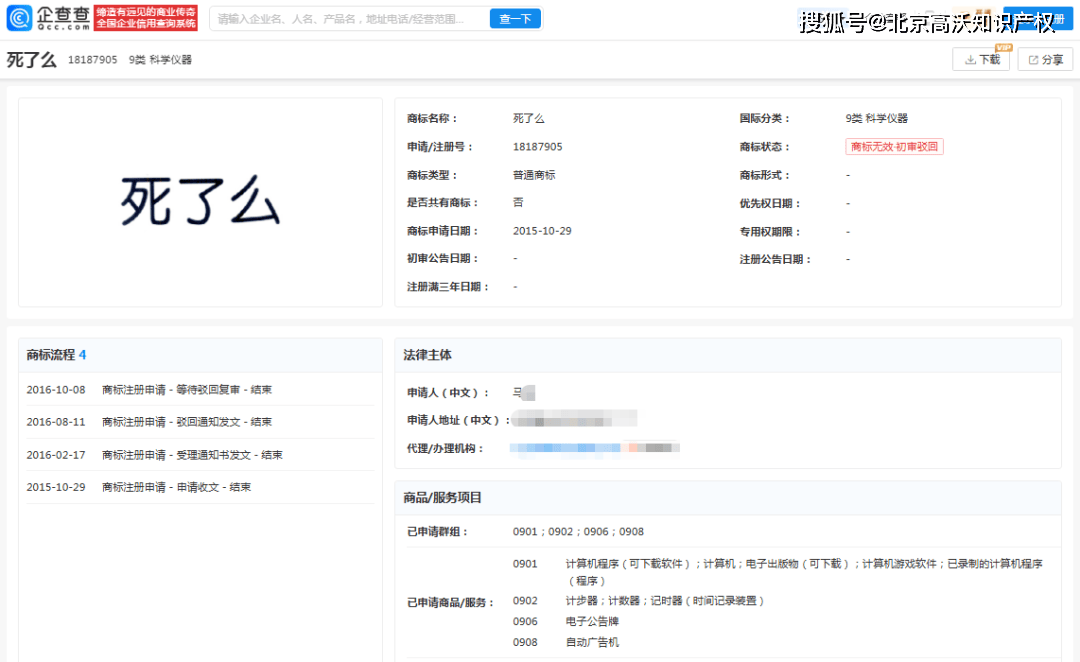 据企查查显示,早在2015年就有一位李某提交了2件“死了么”商标的注册申请,目前均因初审驳回处于商标无效的状态,其中一件就指定使用在第9类,计算机程序(可下载软件)等商品及服务上。